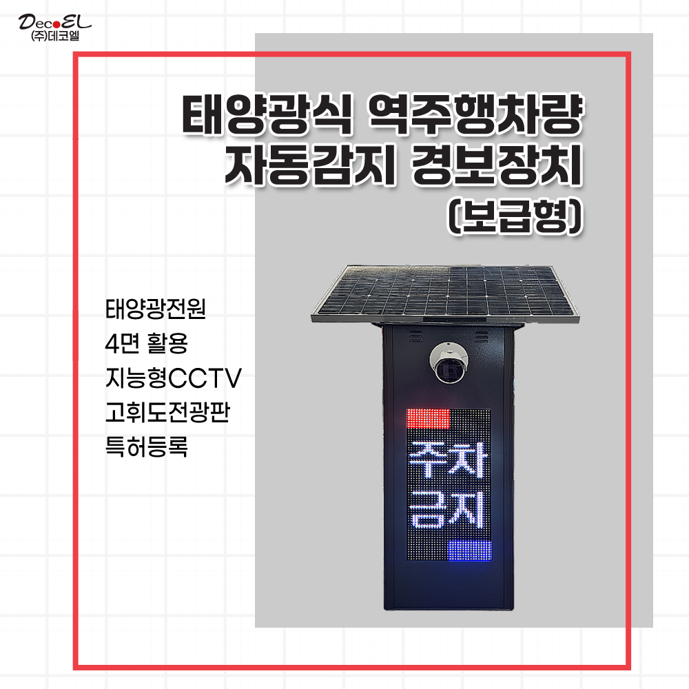AI 지능형 CCTV 센서를 기반으로 실시간 차량을 모니터링하고 역주행을 감지하여 운전자에게 시각·청각으로 경고를 주는 기능을 하여 역주행을 차단하는 경보장치 제품입니다.